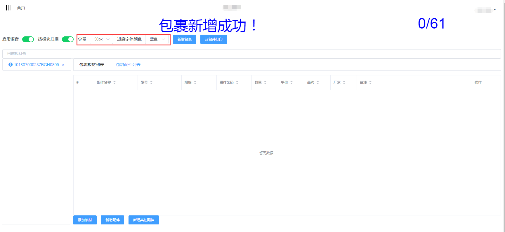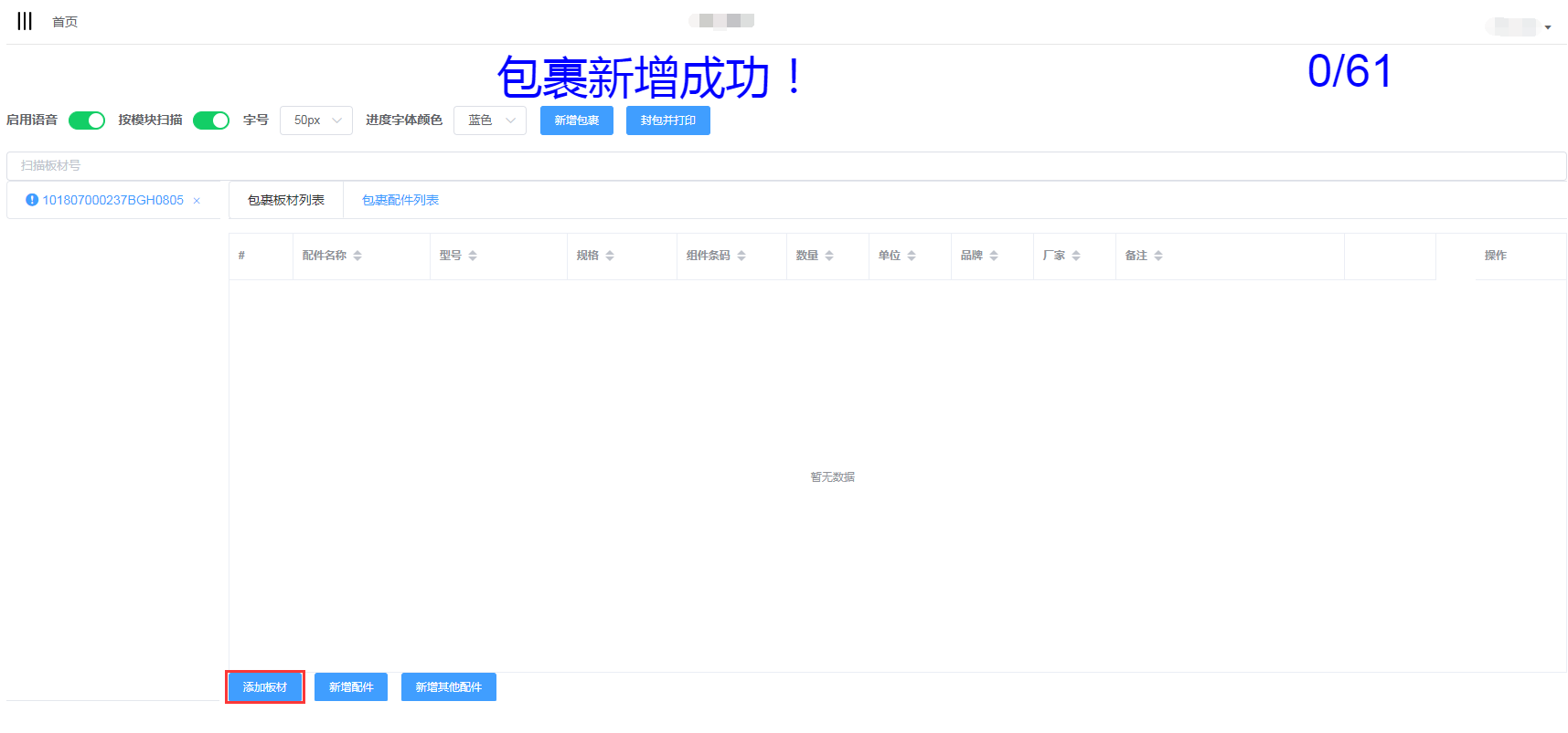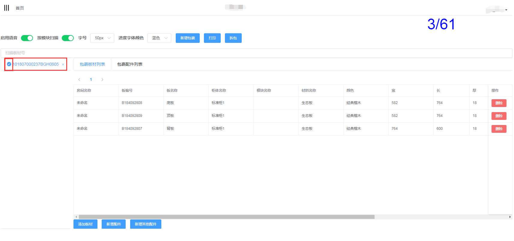备注:当包裹类型是板材,那么打包扫描的只能是板材,配件和组件可以同一个包裹