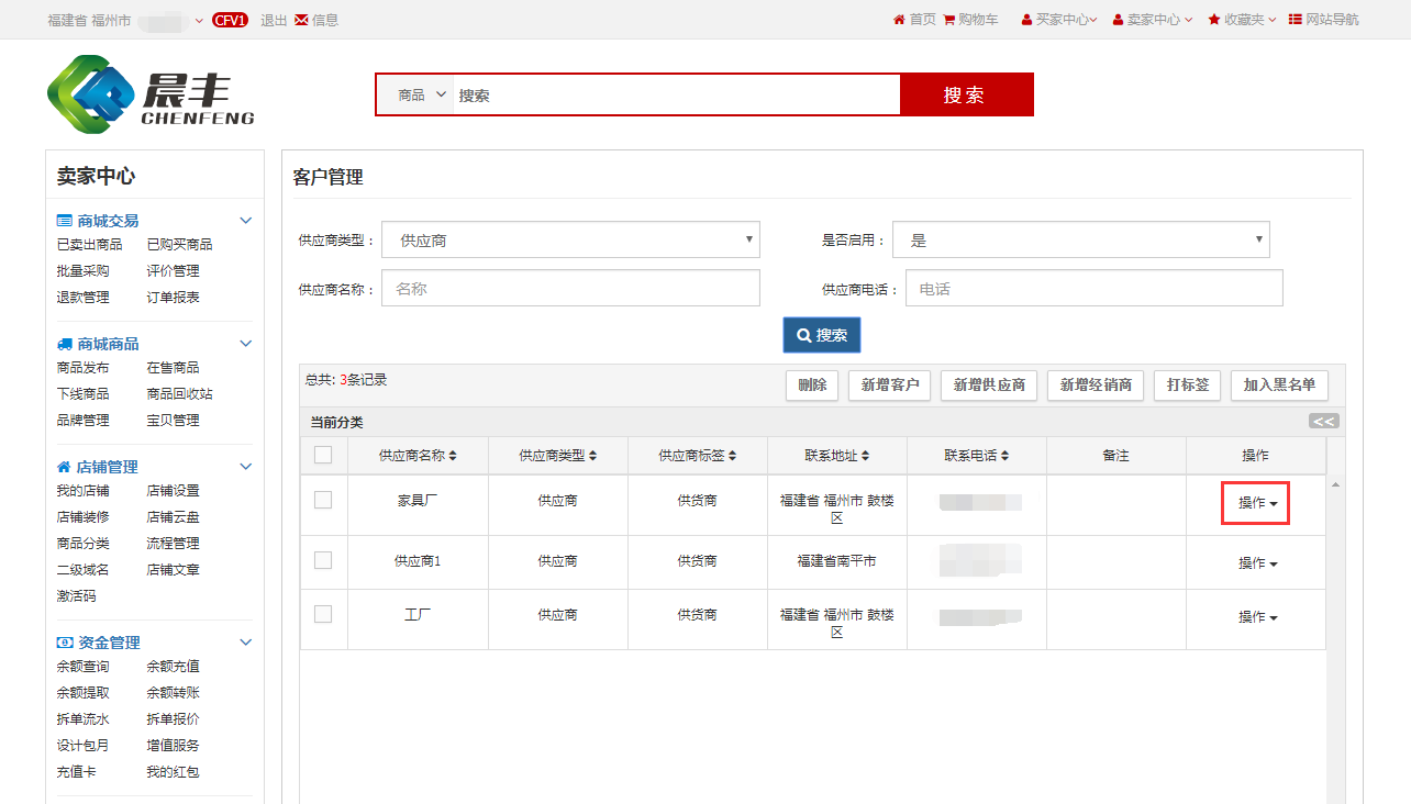 用户也可对门店客户供应商进行备忘,可对备忘设置时间,定时提醒,在指定的时间点,系统会通过微信公众号:福州晨丰产品运营,推送提醒给用户,如图,选择供应商,点击操作