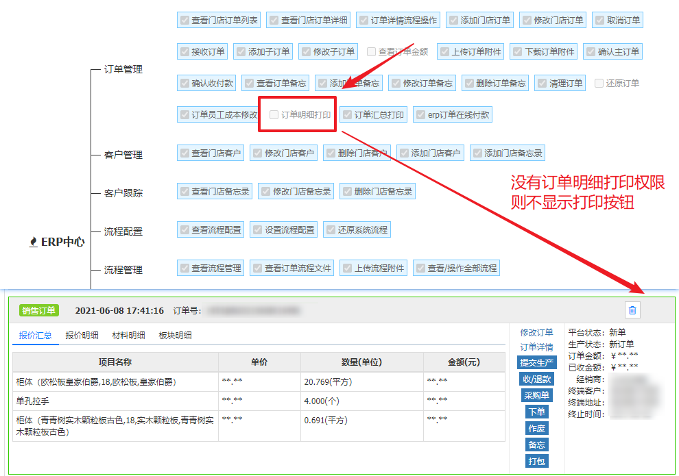 新增:订单打印增加权限点控制,可分配给财务或报价人员