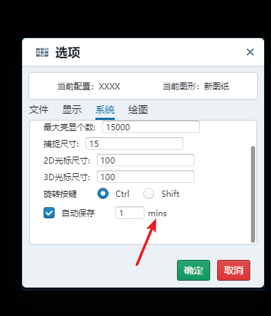 设置中新增自动保存图纸选项,用户可以自行设置;防止图纸意外被关闭;【mins:分钟】