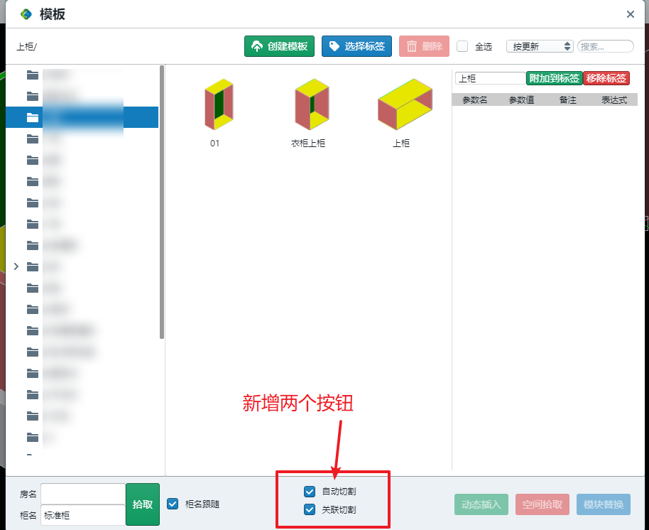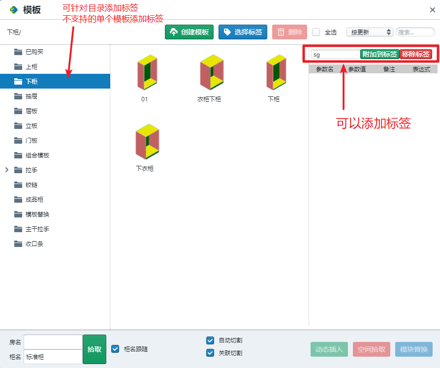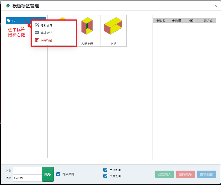 模块管理界面,新增模板标签功;用户可定义标签命令,快捷呼出自定义标签面板;达到快速调用模板;