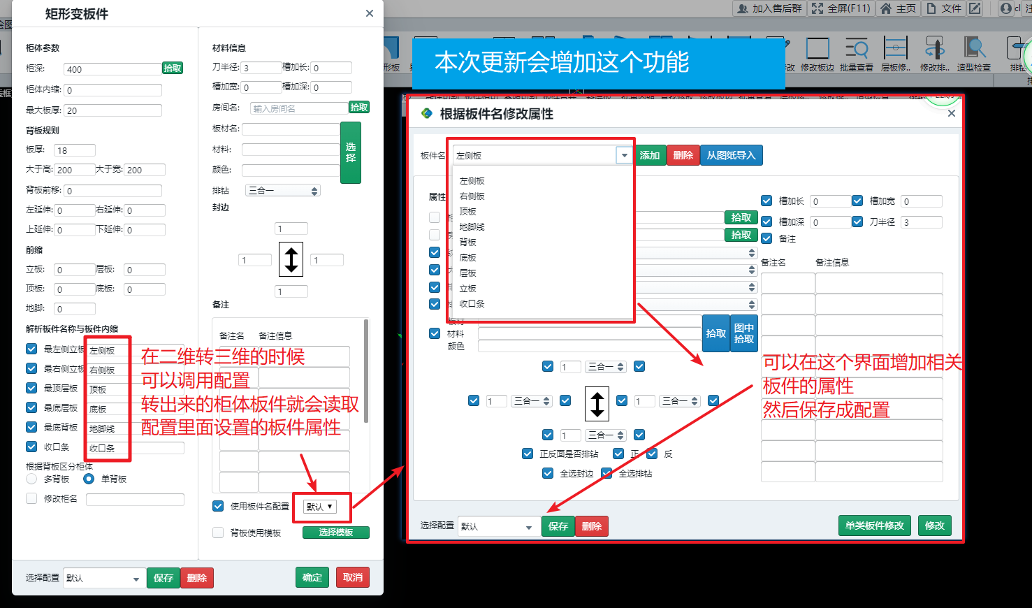 功能主要配合二维转三维使用, 方便用户快速转换;板件属性信息一步到位!