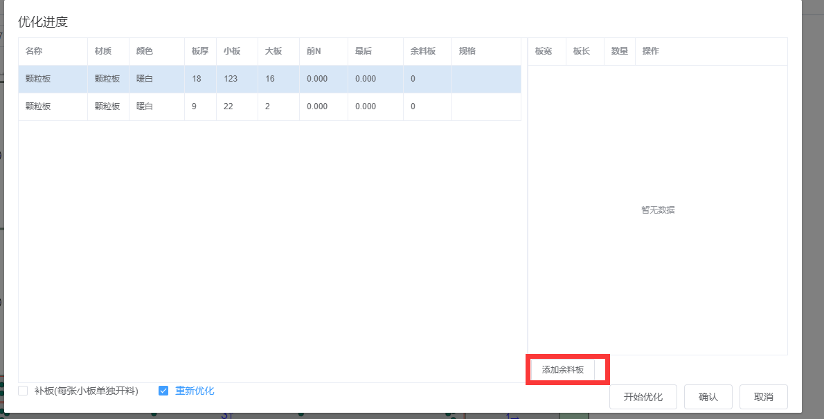 新增功能:余料利用;拆单优化时,会弹出以下界面;具体操作查看详细文档说明