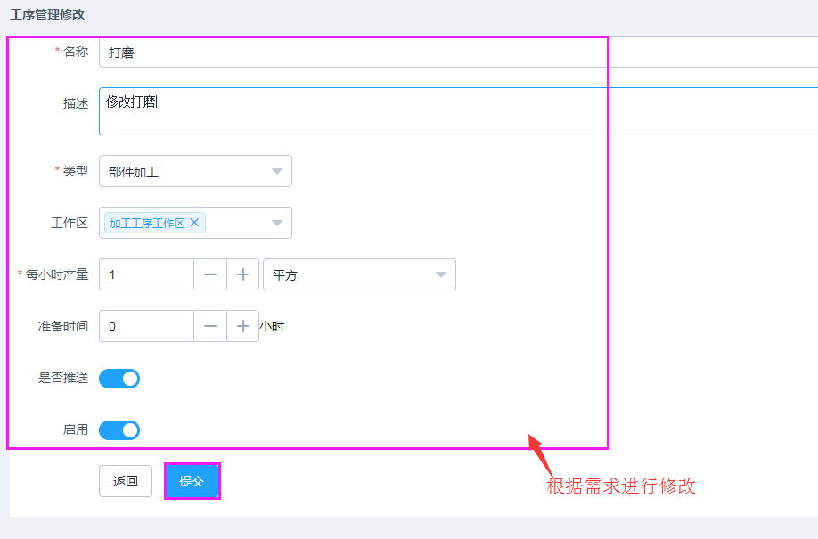 编辑工序内容,“名称”,“描述”,“类型”,“工作区”“是否推送”,“启用”,编辑完成后,点击“提交”,数据保存在工序管理界面;