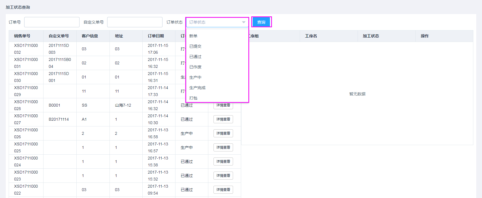 选择生产管理->工序列表->加工状态查询,查询订单的加工状态和加工工序进度和板件信息