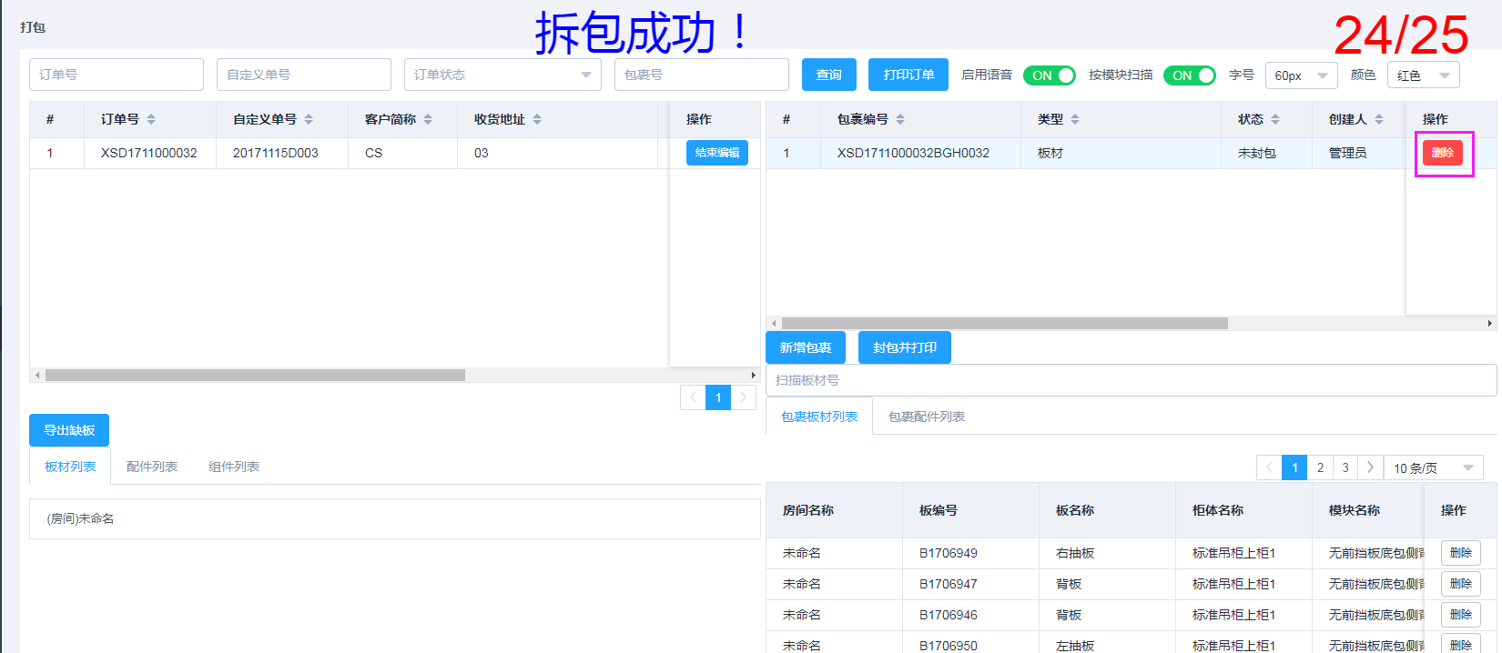 当包裹类型是板材,那么打包扫描的只能是板材,配件或者组件不能同一个包