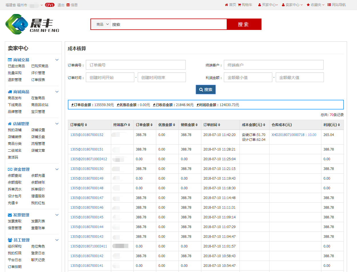 对于erp订单,我们都可对其进行成本核算显示,方便客户进行订单利润查询,成本核算显示的是未取消及未作废的订单,点击卖家中心-erp中心-成本核算,进入成本核算界面