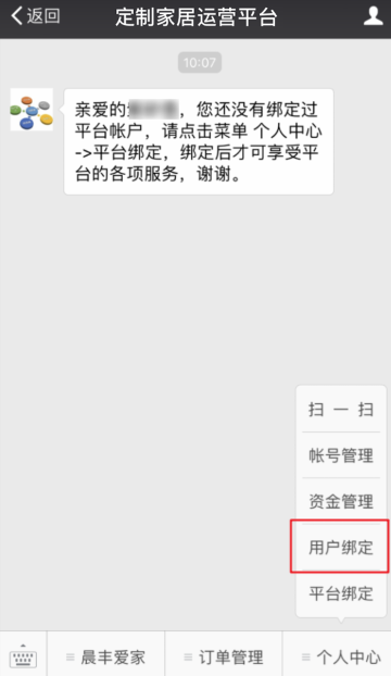 注意:店主与店铺主账号进行平台绑定;员工与员工子账号进行平台绑定;客户与经销商只需要进行用户绑定即可;绑定之后即可收到相关的微信推送;