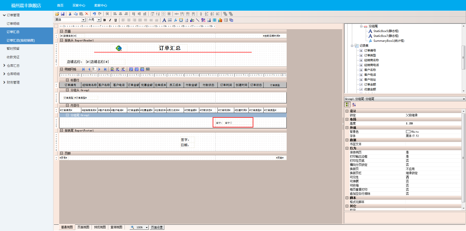 在分组尾可对分组进行合计,首先在一个静态框中输入文字
