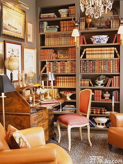 这样的一间书房就像电影中的场景,古典皮沙发,有精美雕花的书桌,满屋的精装书,还有昏暗的灯光……真希望自己也能拥有一间这样的书房!